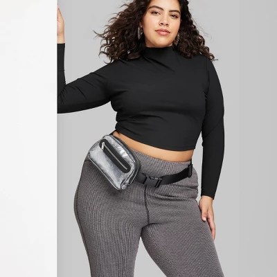 Long-sleeve mock-neck tee from Wild Fable™ in a solid hue. Crafted from an extra-lightweight recycled polyester fabric blend with spandex for stretchy comfort. Tailored in a slim-fit silhouette with a cropped length that hits above the waist. Features a long-sleeve design with a mock turtleneck.